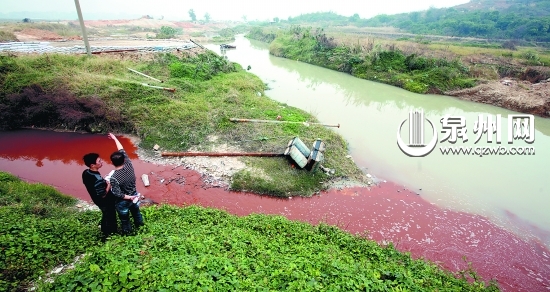 - 2012-02-20九十九溪陈埭段溪水泛红飘臭味 企业排污所致?