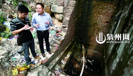 南安市环保局人员向记者介绍排污口情况 (张九强 刘名 摄)