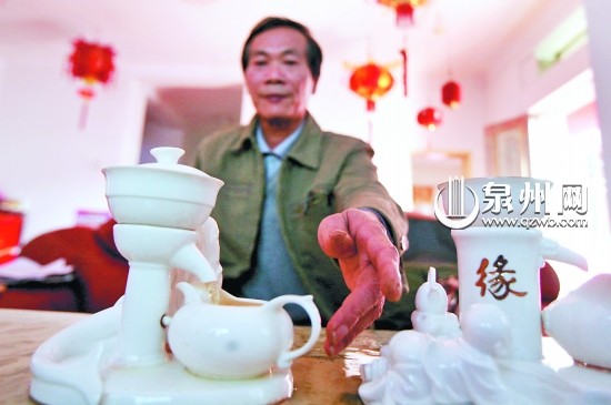 到达曾文水家的时候,曾文水热情招呼我们上楼泡茶。一坐下,桌子上四个白色的陶瓷装置立刻吸引了大家的眼球。看我们好奇的样子,曾文水笑着说:“这个是我发明的新型泡茶装置,它可以自动泡茶。”只见曾文水拿起其中一个镶嵌着美人鱼的物品,美人鱼的背后有一根柱子,柱子上是一个半圆形的装置。“这个是茶水的出水口”,曾文水指着镶嵌在半圆形装置上的一段陶瓷管说。