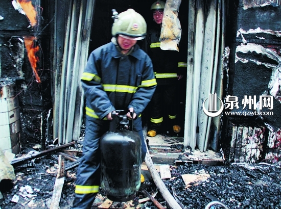 昨天早上6点34分,洛江万安消防中队接警后,立即赶往现场,发现着火现场旁有不少过路群众在围观。消防官兵查看发现,火场后侧是一公司的仓库,旁边有十几间店面。此时滚滚浓烟不断冒出,店内外一片狼藉,门口的瓷砖被烧得脱落,门外的电话亭及树木被烧毁,邻近店面的广告牌已被殃及。一个男子焦急地喊道:“里面有一瓶液化气罐。”
