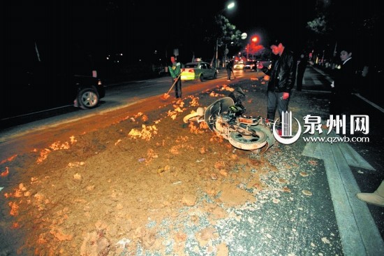 昨晚9时30分左右,泉州市区环城西路靠近临漳门路段,一辆运载泥土的土方车疑因后斗挡板坏掉,沿途“滴洒漏”,出现了一条长约20米,宽近3米的泥泞路,大量洒落在路面的泥土致使过路摩托车摔倒,记者赶到时,见到有3名工人正在现场清理。