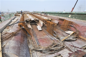 昨日,记者在施工现场看到,主线桥已经完成单线第一次浇筑,工人们正在桥面上进行钢筋加固,桥两侧的两台巨型塔吊机也不停旋转作业。“由于前期施工遭遇地质难题,工期有所延误。”该工程项目的陈经理称,因地质结构复杂,原本短时间就可以建成的桥墩构架,却花了5个月才完成。不过,陈经理表示,工人们正抓紧工期,全面提速,力争在目标时间内完成所有工程项目。