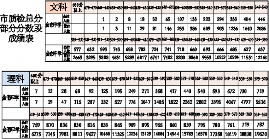 在市质检中,考生总分在600分以上高分段的较多。据统计,文科总分最高分段为660分至669分,600分以上的有253人,530分以上的有2663人,450分以上的有8200人;理科总分最高分段为680分以上,600分以上的有1047人,510分以上的有6275人,400分以上的有15783人。