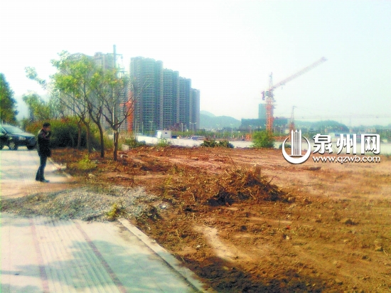 近日,本社热线96339接到报料,称市区城东大街海峡国际广场售楼部门口一大片绿化带消失了,只剩下光秃秃的土地和几株刺桐树。昨日下午3时,记者随泉州市园林执法大队及泉州市卫生考评中心相关人员前往现场,进行走访勘查。园林执法大队相关负责人介绍:“确认违章后,我们会发函要求恢复,并理清赔偿。”