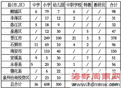 泉州市2012年中小学、幼儿园拟招聘新教师人数汇总表