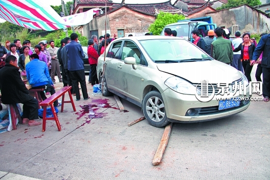 昨日,这一幕发生在泉港界山镇滨海北路。下午1点左右,记者在现场看到,肇事的牌号为闽C8E526轿车还停在路中,后面聚集了众多群众,左侧的地面上留下大摊的血迹。