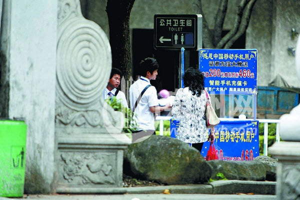 记者接到热线后,立即来到美食街口,这里有几名身背挎包的年轻人正在揽客,只要有人经过,他们都上去推销。在他们身旁是一个简易的摊点,招牌上写着“感恩中国移动手机用户话费充值大赠送,充值200元即刻到账460元”。记者经过时,被一个男子拦下,他声称是北京总部的员工,现正在特价促销,“你一个月电话费多少?充值200元赠送260元,充400元赠送520元,很划得来。而且即刻到账,不需要保底消费。”他还说,为了照顾广大客户,一个号码只能充值一次,最高也只能充值400元。记者看到,他的手上有一个账单,记录着5月5日充值客户的号码及金额,上面已有10多位客户的资料。