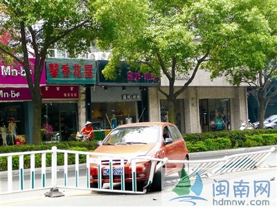 泉州津淮街一轿车撞护栏 女司机受惊瘫坐在路边