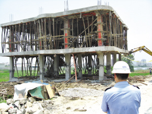 执法人员只好利用怪手,对10多根方形的水泥柱打孔。两个小时后,这栋违章建筑摇晃了几下,轰然倒下。