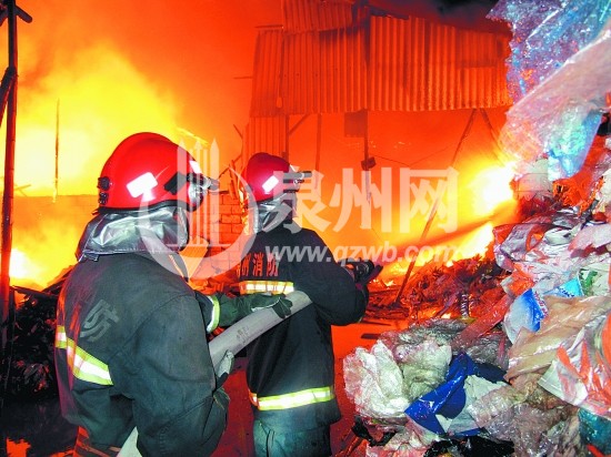 早报讯 (通讯员罗兵 刘书斌 记者王盼琛 文/图)昨日凌晨4时29分,鲤城区南环路一塑料回收加工厂发生火灾,熊熊火势借着风力迅速蔓延,毗邻的厂房、仓库岌岌可危。接到报警后,泉州消防支队特勤大队一中队立即出动3部水罐车、15名消防官兵赶到现场。消防官兵经过一个半小时的奋战,成功将大火扑灭,火灾未造成人员伤亡。