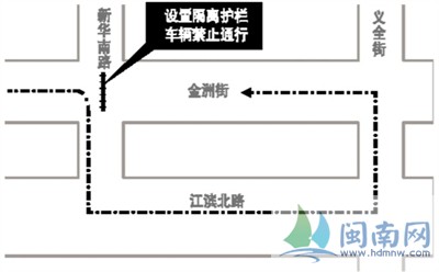 金洲街(新华南路东侧段)由东往西方向要到金洲街(新华南路西侧段)的车辆,提前从义全街拐江滨北路绕行至新门街。