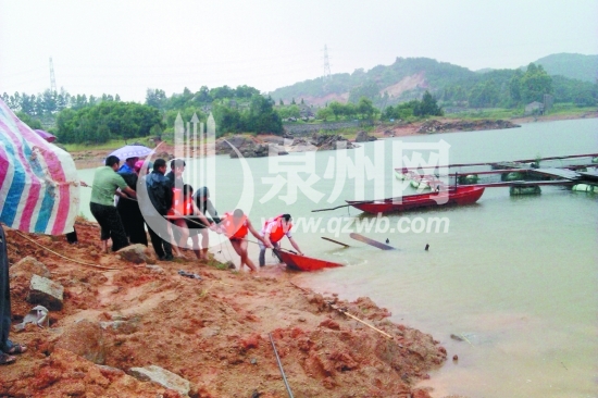 早报讯 (记者林志安 陈桂生文/图)昨日下午3时许,惠安紫山镇突然电闪雷鸣暴雨倾盆,在紫山镇林口工农水库修筑水坝的工人匆忙找地方避雨,6名工人挤上一艘小铁皮划子,想到水库渔排上的木屋避雨。未料途中不慎侧翻,6人落入水中,经众人抢救有4人获救,两名女工溺水身亡。