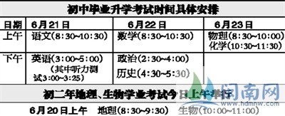 6月21日至23日,初中毕业生参加各类初中毕业升学考试;