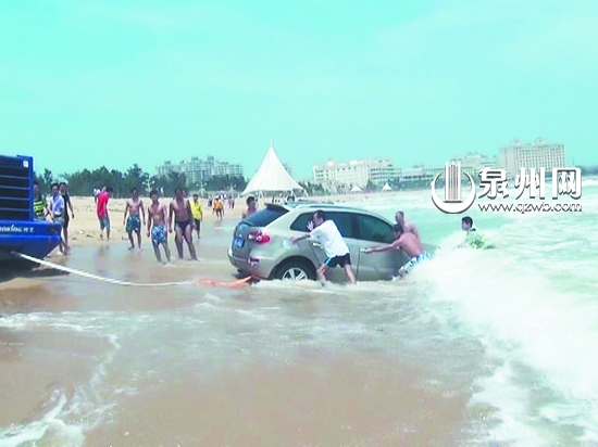 泉州3车主载着摩托艇海边游玩 车停沙滩被淹了