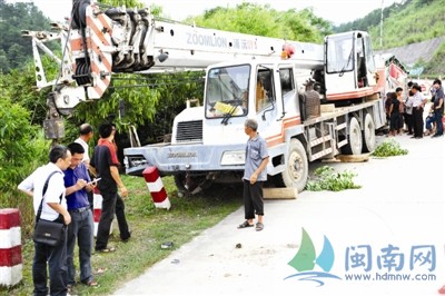 村民们介绍,昨日上午,300多名村民为村里的一名老人送葬。在回来的路上,大家都走在下坡路的右侧。突然,一辆大吊车飞快地往坡下冲来,村民们纷纷闪避,大吊车先是撞倒了放在路边的两辆摩托车。接着,躲闪不及的赖某生被碾到了车轮下,赖某转和赖某怀父子也被撞倒。直到撞到路边的两根水泥路桩后,大吊车才停下来。赖某生当场身亡,身受重伤的赖某转和赖某怀父子被紧急送往医院抢救。