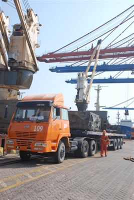 新进口的一批荒料石正运往后方堆场