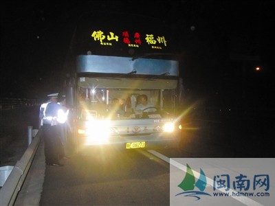 前晚10时5分,一名乘客向泉州高速交警举报称,一辆福州开往广东佛山的大客车超载,车牌为粤E08272,从沈海高速泉州入口上了高速。