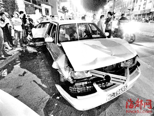 在事发现场,记者来到300米远的绿岛国际酒店门口,一辆车牌号为闽C95B70白色轿车车头撞到停在路边的一出租车尾部,这辆出租车又撞到前面一辆出租车和一辆奔驰轿车。