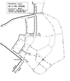 途经南区中学路口欲经管制路段往泉州方向的4吨以上(含)大型货车、大型客车,从长兴路、博览大道绕行;小型车辆也可从长兴路、梅岭路或长兴路、西环路、桂华路、梅岭路或长兴路、和平中路绕行;非营运小型车辆也可从长兴路、泉安路绕行。安海、社马路方向往泉州方向的车辆也可从世纪大道晋光路路口经晋光路、高速公路连接线或高速公路行驶。