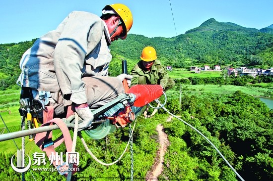 上半年,泉州市全社会用电累计177.22亿千瓦时,其中,安溪县用电量增长率居全市第一。为确保电网安全迎峰度夏,电力工程队冒酷暑在官安线更换老化绝缘构件,保障电力线路通畅。 (刘伯怡 摄)