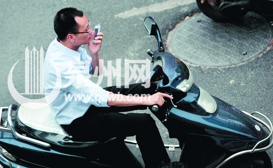 电动车驾驶者,估计是嫌周围太嘈杂,干脆把手机拿到嘴边通话,单手扶着车把。