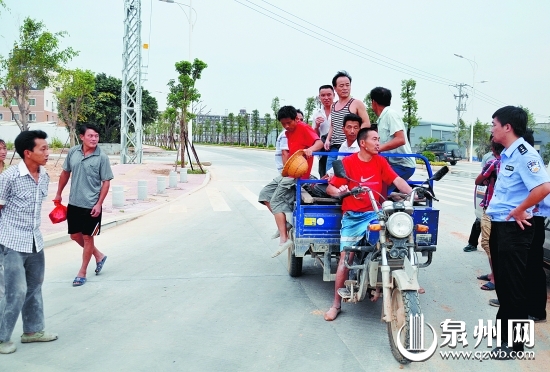 晋江一辆小小三轮摩托车 竟载满18人路上狂奔