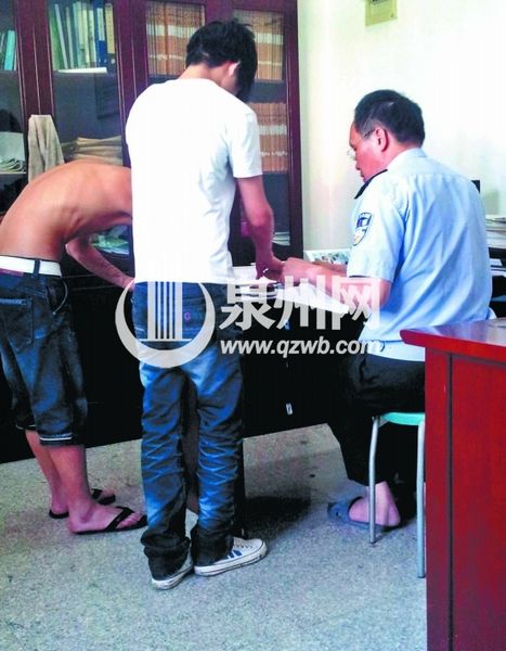 获救的小周(穿衣者)与堂哥在水上派出所做询问笔录