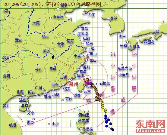预计“苏拉”未来将以每小时15~20公里的速度向西北方向移动,气象部门估计,今天下半夜到明天在福建中北部到浙江南部一带沿海登陆。
