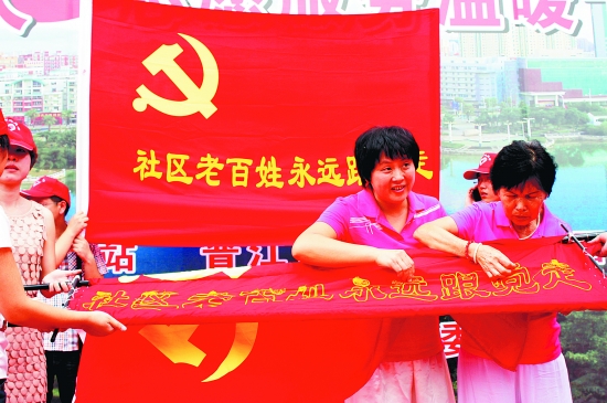 当前,正值党的十八大召开前夕,通过社区接力绣红旗、网上绣红旗等形式,晋江广泛动员,号召党员、群众绣红旗、颂党恩、践承诺、办实事,积极参与社区志愿服务活动,为十八大胜利召开营造良好的社会氛围。