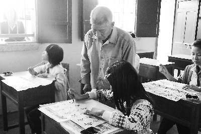 南安市霞美镇金山村的老同志教小朋友写书法。