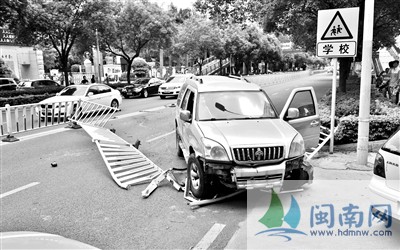 泉州津淮街为避车辆 越野车撞护栏幸无人员伤亡