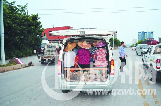 执勤民警打开车门,车内挤满人。仔细查看,该面包车座椅已被拆下,前后摆上3条长凳子,凳子上坐满人,椅子下还密密麻麻放着锄头等工具。