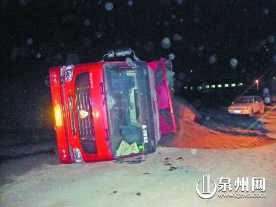 本报讯 (通讯员 陈尚航 记者 吴水保 文/图)前日晚上8时许,在晋江陈埭溪边民族中学路段,一辆满载沙子的土方车行驶在坑坑洼洼的路面上,因严重超载,失去平衡后侧翻,整车的沙子倾覆路面。