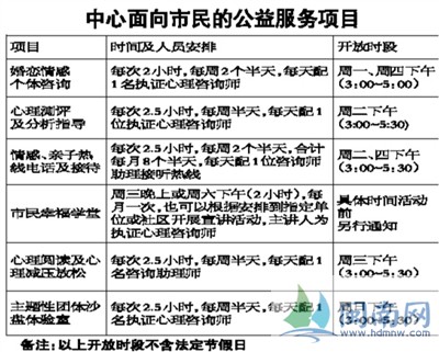 心理服务中心内设有心理宣泄放松室、催眠放松治疗室、儿童游戏治疗室等各种不同功能的服务区。中心成立后,每年都会为部分贫困妇女儿童提供免费的心理治疗,并为妇联系统培训10名心理咨询师。在每周的固定时段,中心还将面向广大市民提供不同的公益服务项目,其中的“市民幸福讲堂”项目前四堂课的预告内容已经出炉,讲座的具体时间将另行通知。