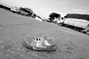 事发路段是社马路与村道的交叉路口。在往青阳方向的车道上,覃阿婆尸体已被棉被盖上。她身旁,是一本打开的小学课本和文具盒,1米多远处,一双小女孩的布鞋落在一旁。肇事的大卡车停在10多米远处的最内侧车道上,车上满载货物。