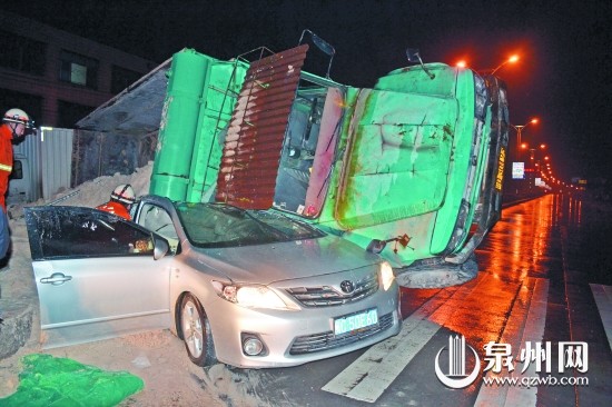 本报讯 (记者杨佳彬 通讯员吴文霞 蔡明聪 文/图)昨日2时许,在国道324线南安官桥镇金发大酒店门口,一辆土方车侧翻压到轿车,轿车内1人不幸遇难。
