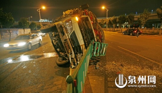 泉州江滨路一辆满载货车侧翻 撞破一段护栏