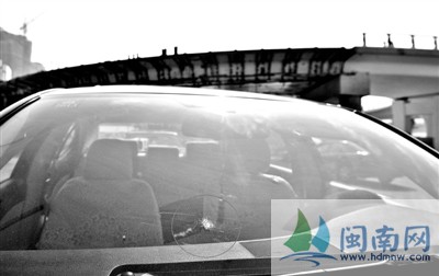 东南网-海都报闽南版12月15日讯(记者 林莉莉 本报记者 吕波 文/图) 昨天上午11时许,林先生驾着一辆红色的雷克萨斯轿车,走在泉州市区江滨北路上,途经田安大桥下时,天上突然掉下火花,他来不及躲闪,车子的前挡风玻璃上顿时烧出了3个拇指大小的浅坑。