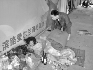 20日上午,在青阳街道阳光社区某酒吧附近,一名流浪汉躺在墙角,头发蓬乱,男子身边堆放着到处捡来的垃圾。据周围群众反映,这名流浪汉已经在这里“驻扎”一个多月,精神状况不好。“身上盖的毯子很脏也很潮,我们就给他送了一件新的军被。”救助站工作人员说,男子确实患有精神方面疾病,在工作人员到来前,他只用薄薄的毯子盖住一截身体。除了被子,工作人员还给流浪汉送去了几件厚实的过冬衣服并送了盒饭。当天,这名流浪汉被送往疗养院接受救治。