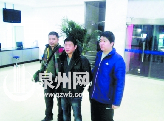 民警从东北将嫌疑人(中)押回泉州 图片来源:东南早报