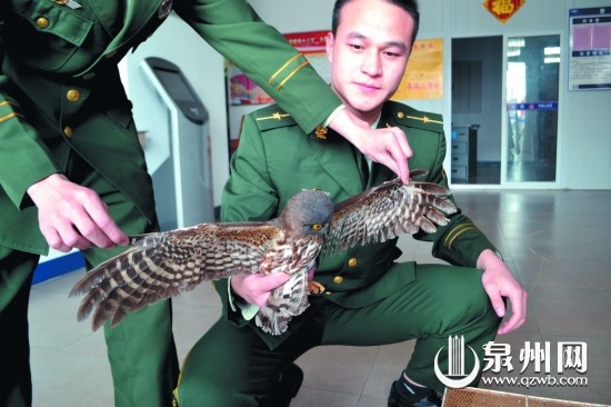 惠安东岭边防派出所官兵在大走访时,发现辖区东埭村许某家门口一个鸟笼里关着一只猫头鹰。经查问,村民许某称是其在田地里看到的,当时猫头鹰腿部受了伤已经飞不起来,他便将猫头鹰带回来,准备要杀了后炖着吃。