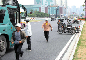 世纪大道上,一辆客车停下,摩的司机一拥而上。