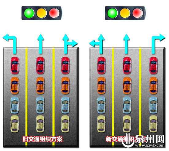 据了解,一段时间来,不少市民反映,涂门街拐温陵路、津淮街拐温陵路的右转车流都被直行车流挡住,使得车辆通过率低,右转车辆不受灯控影响的优势体现得不够明显。市交巡警支队设施大队刘警官介绍,他们在对现场进行实地测算后,决定对标志标线作出调整。调整后的路口,两个方向的最左车道,由左转车道变为直左车道,中间直行车道保留不变,最右车道由直右转道变为右转车道,而右转灯控也处于长绿状态(详见上方示意图)。