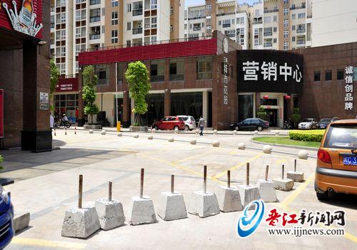 昨日上午,记者来到兰峰城市花园营销中心斜对面,大多停车位上都停着车。而在“老三元”餐饮店前,横竖划有五六个车位,倒是一辆车都没停。原来那里一边被几块大石头围堵住,一边则用几根红白相间的铁柱锁在地上,车子根本开不进去。