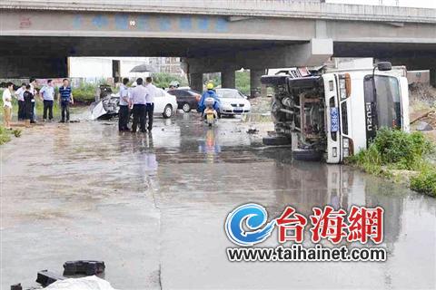 晋江磁灶一小车飙速 货车被撞翻滑行11米才停