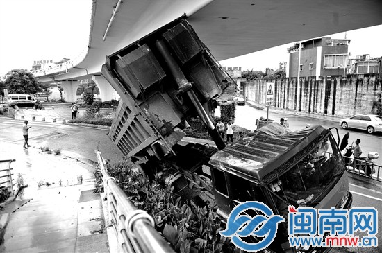 顺济新桥引桥后斗高高翘起 土方车一侧悬空卡桥下