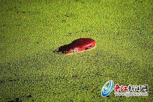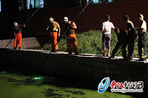 昨晚10时许,记者到现场看到,消防官兵正在用3个抽水泵抽池塘里的水。该池塘约60平方米,夹在两栋房子中间,水面上浮满了绿色的水藻。