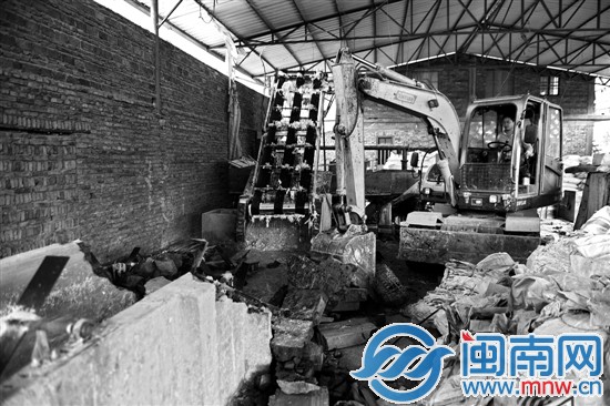 昨日,该厂工人已经散去,但厂方老板、负责人仍未现身,甚至连住在厂房隔壁的房东吴某也不知去向。为防该厂“死灰复燃”,联合执法组调用挖掘机彻底推倒该厂生产线。