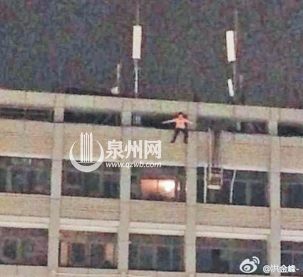 事发的商住楼共有9层。当时,该女子身穿黑色长裤、粉色上衣,独自一人坐在9楼围墙上,双脚悬空面朝马路,双手平展做跳楼的动作。