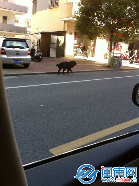 藏獒旁若无人般在大街上晃悠(永春县广播电视台李伟杰供图) 东南网11月26日讯(海峡都市报闽南版记者 涂传之)昨日上午,在永春县城街头,一只藏獒旁若无人地四处溜达,吓坏众路人。不过,意外的是,这只藏獒很温顺,民警唤来捕狗人,用自制工具将其轻松擒获,送往永春县警犬培训基地寄养。 发现藏獒并报警的是永春县广播电视台的记者小陈一行,当时众人采访返回途中,在永春县城城东街,发现一只黑色大狗在路中独自晃悠,一行人中有位爱狗之人,一眼认出这只大犬“长毛虎脸菊花尾”,是一只几个月大的幼年藏獒。 虽说藏獒未成年,可其体长足足1米有余,外形威风得很。不少路人看见藏獒都退避三舍,绕路而行。小陈猜测,藏獒毛发有些脏乱,没什么精神,颇为温顺,可能是走失后流浪的,它沿路晃悠,只在垃圾桶稍许停留翻找一番。直到溜达出1公里后,才趴在一棵行道树下休息。 小陈一行人一边报警,一边驾车跟着藏獒。永春桃城派出所民警出警而来,见着大狗,民警和协勤人员五六人也有些发怵,不敢贸然靠近,遂一边通报上级,一边找来一名民间捕狗人。捕狗人见藏獒很温顺,拿条铁丝围了个圈,往狗脖上轻松一套,藏獒起身跳了跳,竟乖乖跟着捕狗人走了。 永春治安大队下辖警犬培训基地人员随后赶到,将藏獒带走暂且收养。警方称,如果无人认养,不排除训练这只藏獒成为警犬的可能。